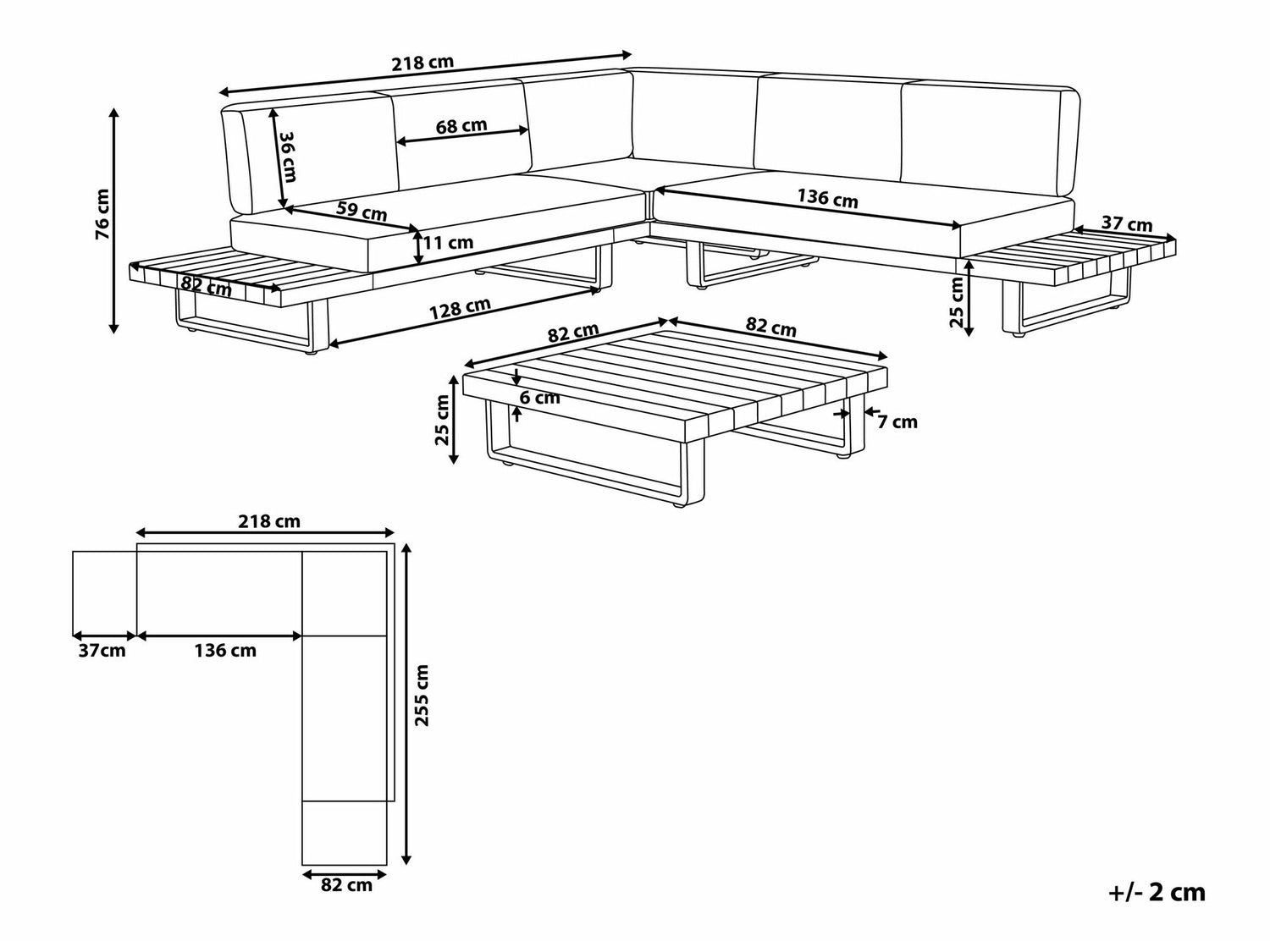 Sofos matmenys76 x 255 x 255 cm