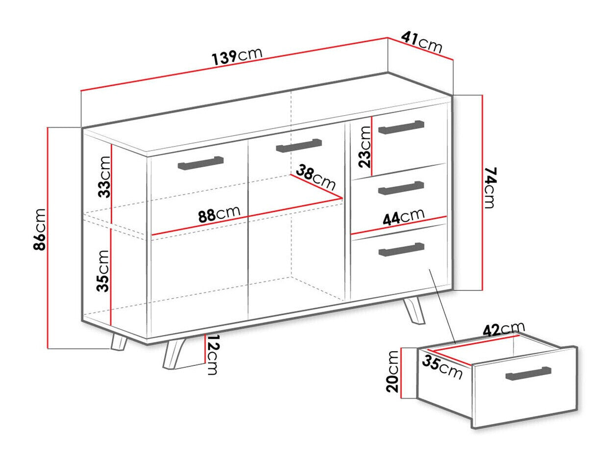 Komodos matmenys86 x 138.5 x 41 cm