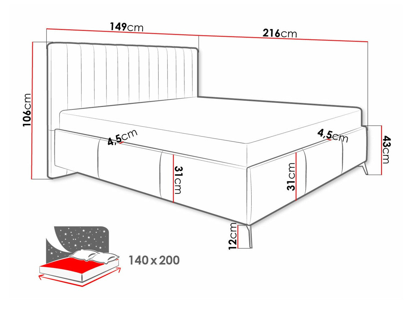 Patalynės dėžės matmenys12 x 203 x 142 cm