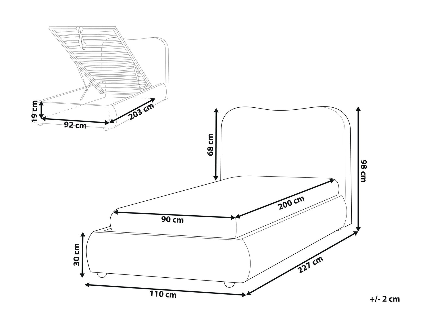 Patalynės dėžės matmenys19 x 92 x 203 cm