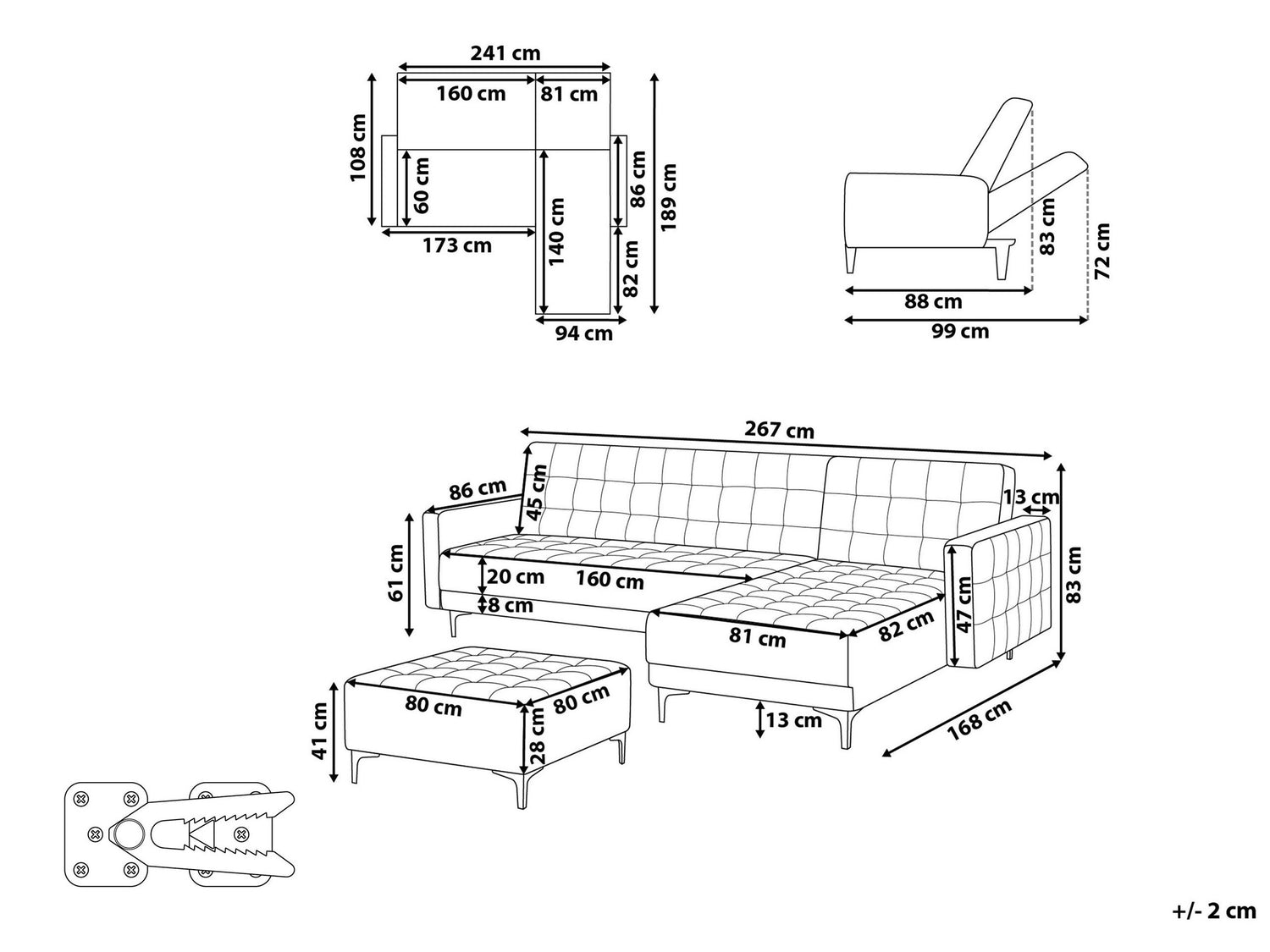 Pakuotės išmatavimai1 X 190 x 83 x 29 (cm) / 34 kg1 X 87 x 49 x 27 (cm) / 12 kg1 X 162 x 110 x 29 (cm) / 33 kg1 X 82 x 82 x 29 (cm) / 13 kg