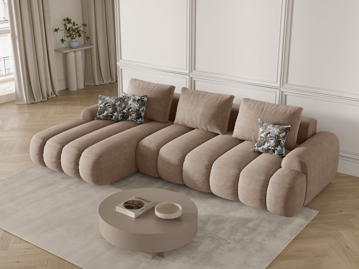 Nugarinės baldo dalies audinys nesiskiria nuo pagrindinio baldo audinio. Šia savybe pasižyminčius baldus galite statyti kambario viduryje.