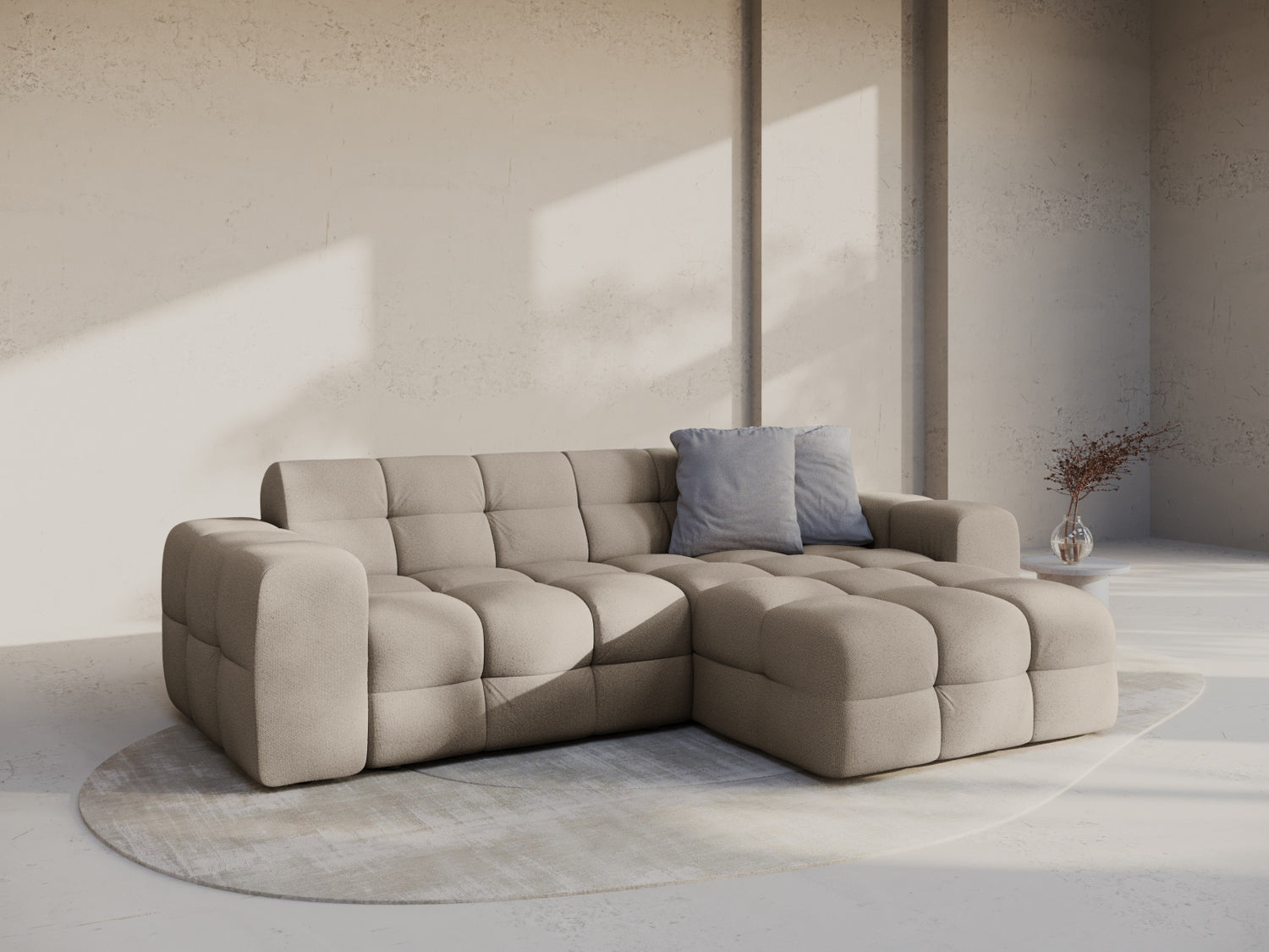 Žiūrint iš priekio, dešininio varianto atsikišusi dalis jums bus iš dešinės pusės. Pasirinktas kampo variantas turėtų padėti kambariui atsiskleisti ir leisti organiškai judėti erdvėje.