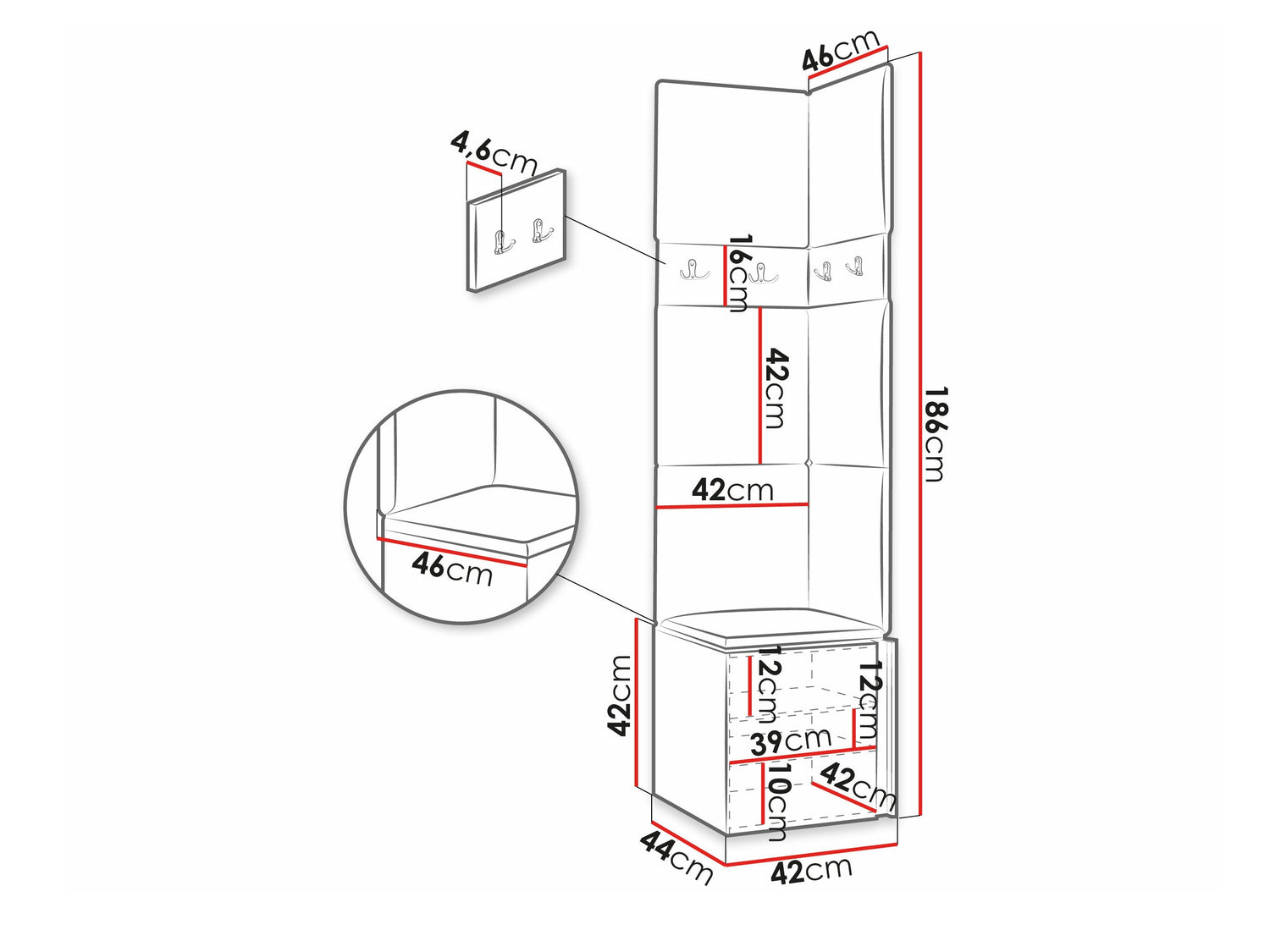 Kabyklos matmenys16 x 42 x 4.6 x 46 x 4.6 cm