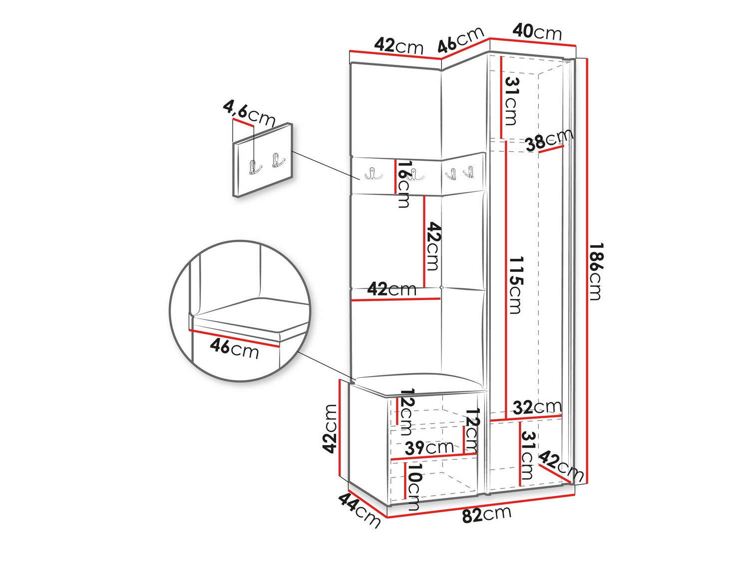 16 x 42 x 4.6 x 46 x 4.6 cm