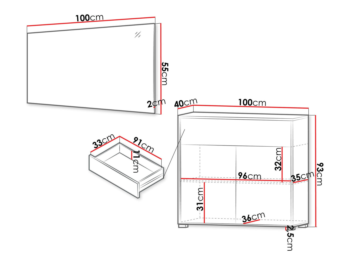 Komodos matmenys93 x 100 x 40 cm