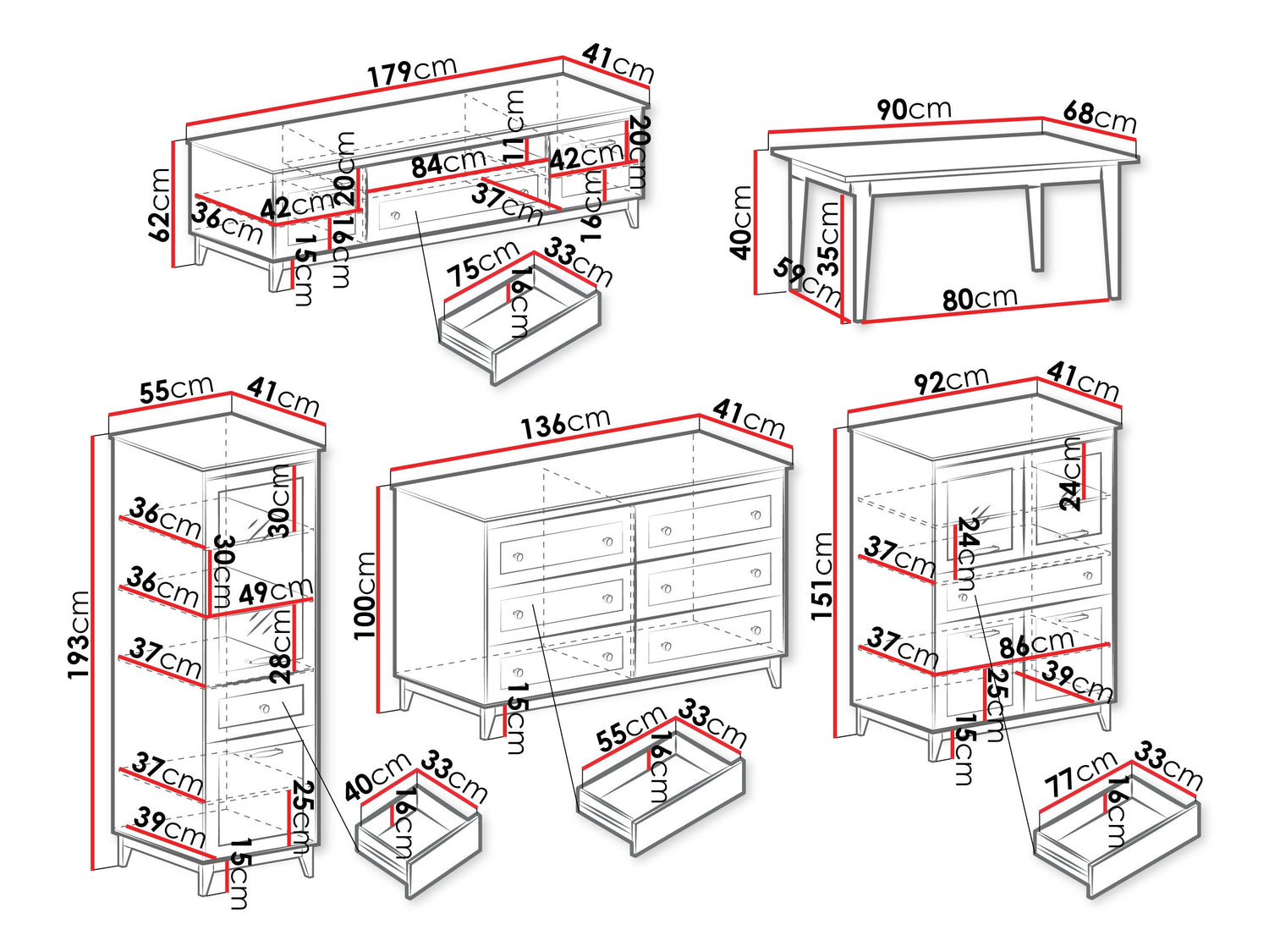 Komodos matmenys100 x 136 x 41 cm